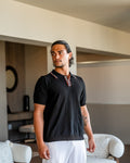 Eine zeitgemäße Interpretation des klassischen Polos, gefertigt aus einem weichen Viskose-Polyester-Mix für Atmungsaktivität und Struktur. Die subtile Fischgrättextur verleiht Tiefe, während kontrastierende Paspeln am Kragen und der Knopfleiste einen raffinierten Akzent setzen. Maßgeschneidert für eine schlanke Silhouette, perfekt für sowohl legere als auch gehobene Styles.