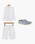 Das Tranquil Set verkörpert das Wesen von minimalistischer Eleganz. Gefertigt aus weichem Leinen und Wildleder, umfasst diese Kollektion ein klassisches Hemd aus 100% Leinen, entspannte Leinen-Shorts und raffinierte Wildleder-Slipper – alles in neutralen Beigetönen, die diejenigen ansprechen, die stille Raffinesse und zurückhaltenden Stil schätzen.